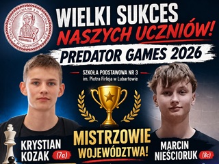 Z ogromną radością i dumą informujemy o sukcesie reprezentantów Szkoły Podstawowej nr 3im. Piotra Firleja w Lubartowie w ogólnopolskich rozgrywkach międzyszkolnych Predator Games. Nasi uczniowie udowodnili, że pasja, trening i strategiczne myślenie prowadzą na sam szczyt!