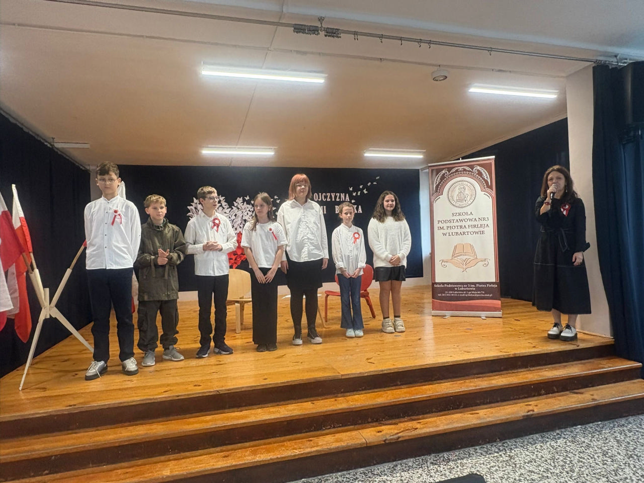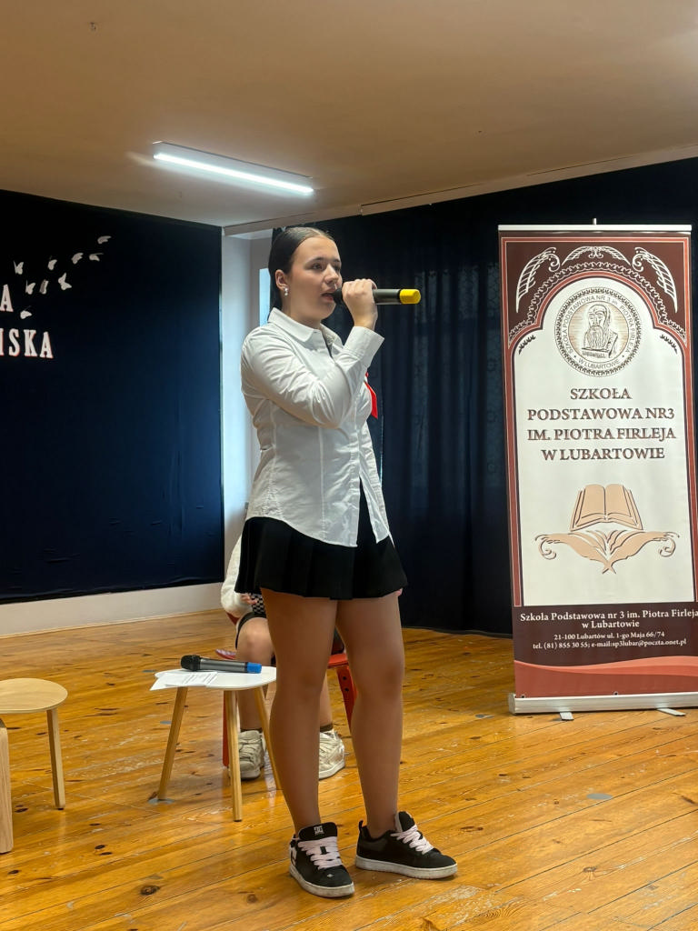 W montażu słowno-muzycznym przypomniano najważniejsze symbole naszego kraju oraz oddano hołd tym, którzy walczyli o wolność. Akademię przygotowali uczniowie z klasy 5C oraz chór szkolny klas 4–8 pod opieką pań Barbary Zegar i Emilii Sobczak- Chudzik.