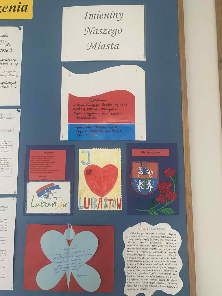 22 listopada 1744 roku książę Paweł Karol Sanguszko - właściciel Lewartowa - za zgodą króla polskiego Augusta III, odnowił prawa miejskie, nadał nowy herb i zmienił nazwę miasta z Lewartowa na Lubartów. Pamiętamy o tym ważnym wydarzeniu dla naszej Małej Ojczyzny oraz znamy jej symbole: czerwono-niebieską flagę, hymn Lubartowa pt. „O Ziemio Lubartowska” oraz herb miasta. Cieszymy się bardzo, że dużo naszych Uczennic i Uczniów przyszło ubranych w barwy naszego miasta symbolicznie pokazując, że kocha Lubartów i zna jego historię. Nauczycielki historii, Samorząd Uczniowski oraz Dyrekcja szkoły dziękują wszystkim za aktywny udział w tym patriotycznym projekcie.