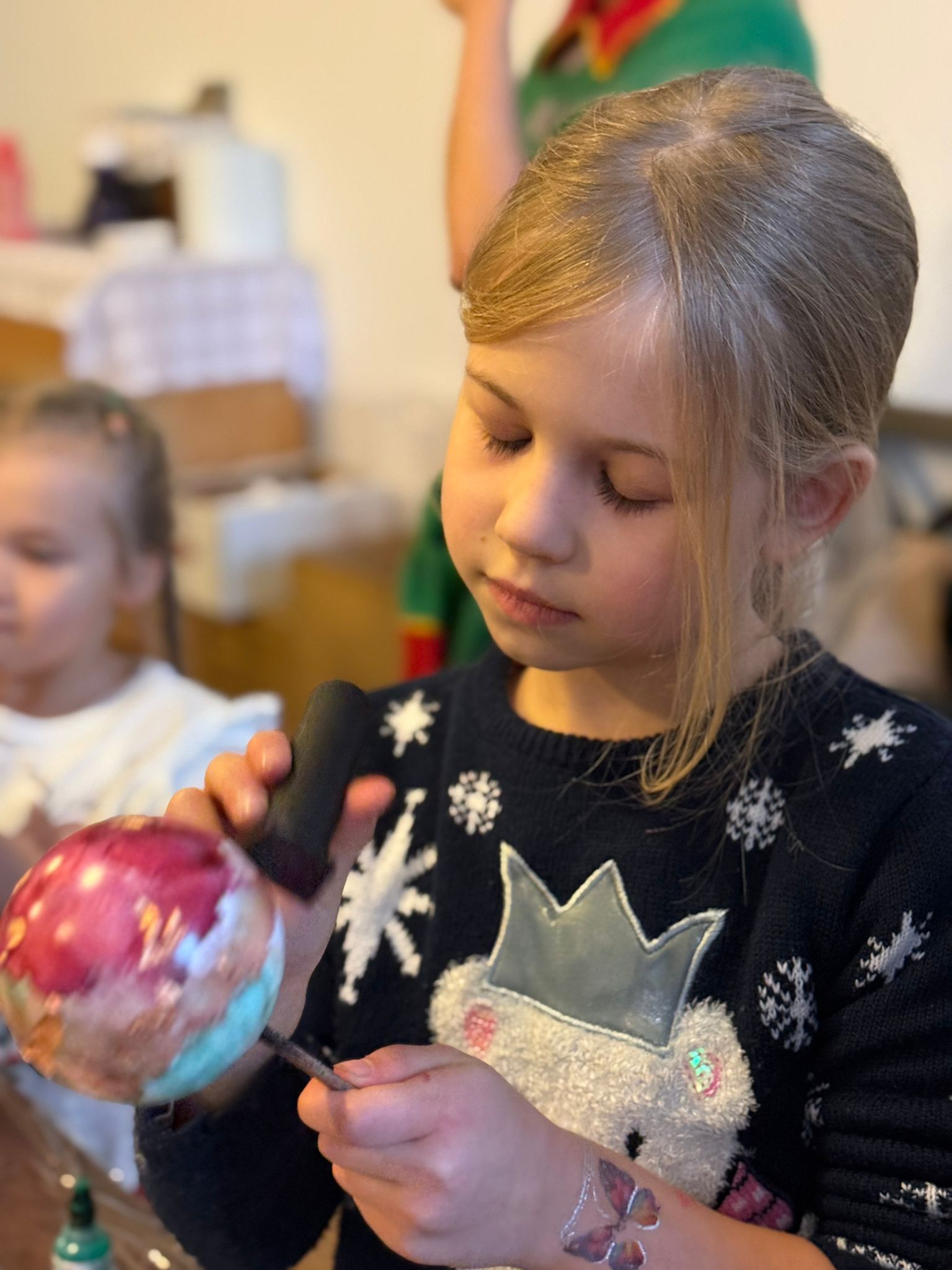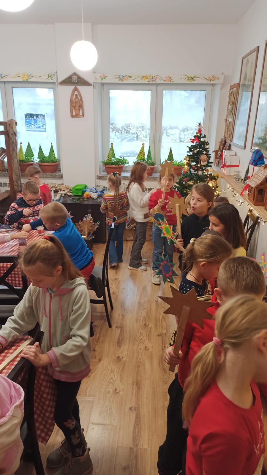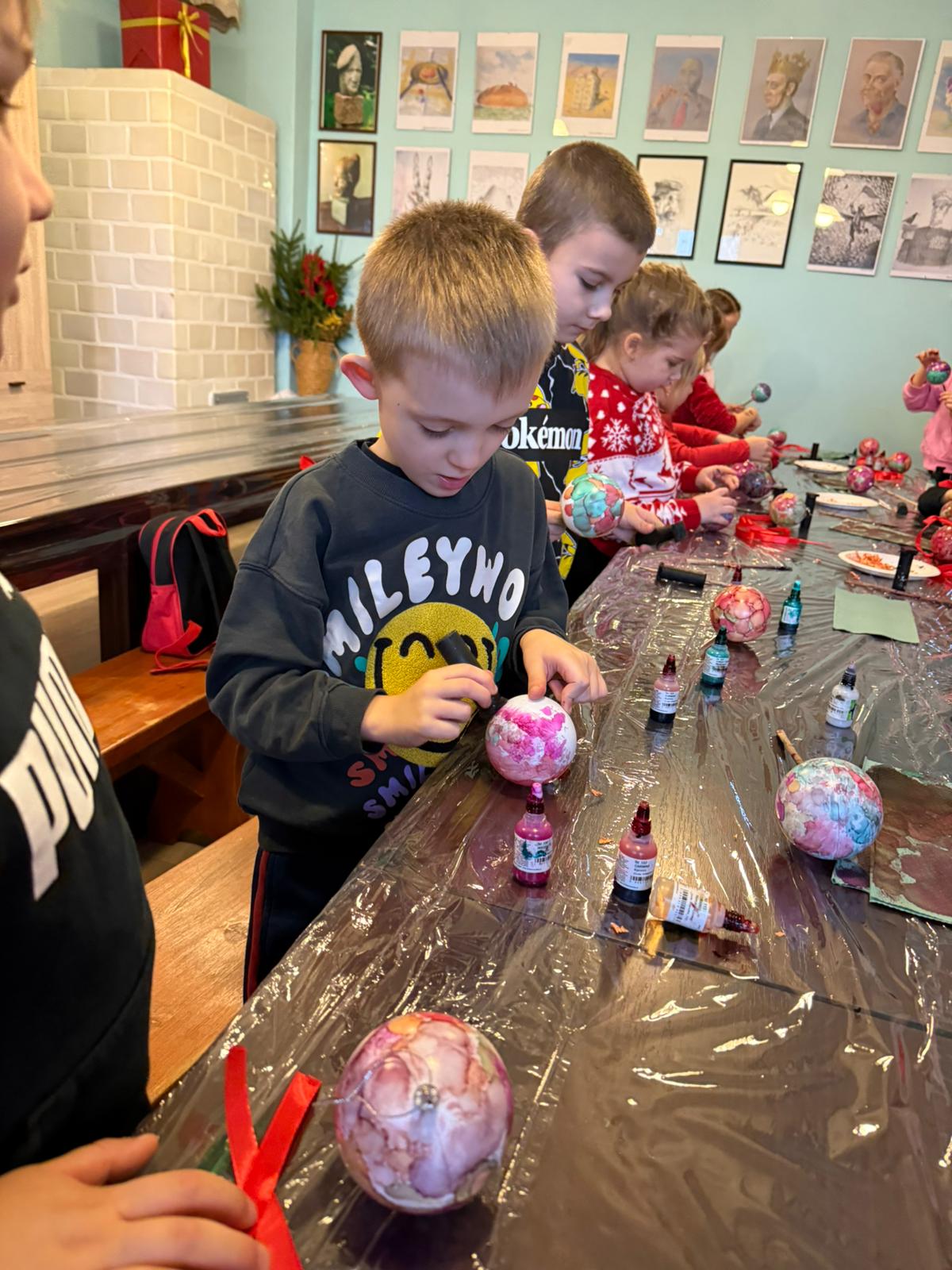 Na miejscu czekało na nas mnóstwo atrakcji. Elfy, czyli pomocnicy Świętego Mikołaja zorganizowali dla nas warsztaty, podczas których ozdabialiśmy bombki i gwiazdy kolędnicze. Rękodzieła wyszły przepiękne i na pewno udekorują nasze domy. A może będą prezentem dla kogoś bliskiego? Kolejną atrakcją była przejażdżka ,,saniami'' podczepionymi do traktora. Kulminacyjnym punktem wycieczki było długo wyczekiwane spotkanie ze Świętym Mikołajem. W przepięknej świątecznej scenerii, z kubkiem pysznej i cieplutkiej czekolady rozmawialiśmy z prawdziwym Mikołajem. Po kilkukrotnym zapewnieniu, że jesteśmy bardzo grzeczni, otrzymaliśmy prezenty i zrobiliśmy pamiątkowe zdjęcia.