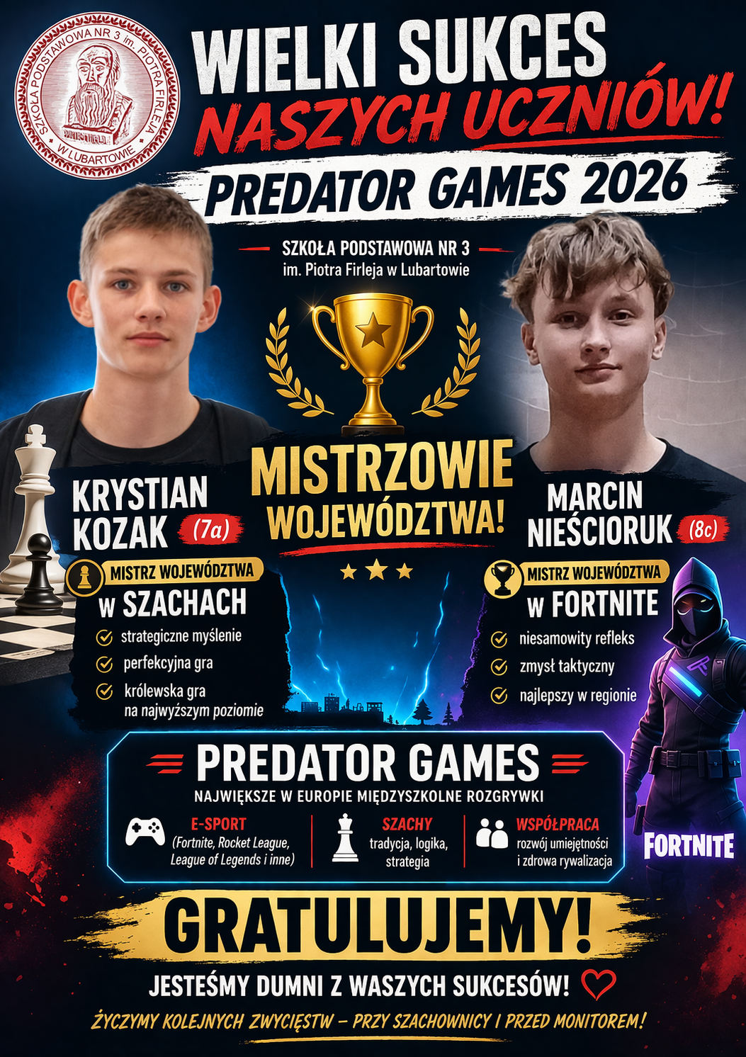 Serdecznie gratulujemy Krystianowi i Marcinowi! Jesteśmy dumni, że reprezentujecie barwy naszej szkoły i życzymy Wam kolejnych sukcesów – zarówno przy szachownicy, jak i przed monitorem komputera.