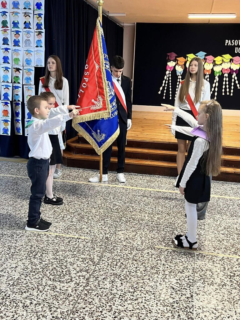 Pierwszoklasiści, ubrani na galowo, złożyli uroczyste ślubowanie na sztandar szkoły, obiecując być pilnymi uczniami, dobrymi kolegami i godnie reprezentować naszą szkołę.