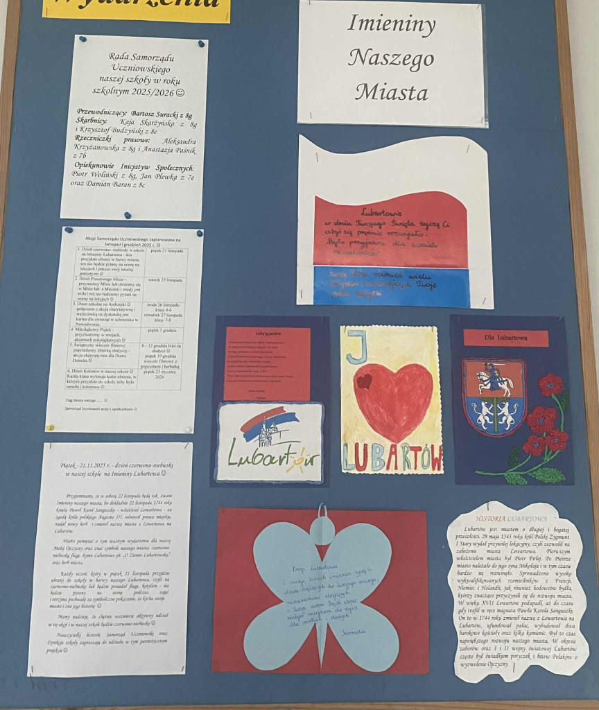 22 listopada 1744 roku książę Paweł Karol Sanguszko - właściciel Lewartowa - za zgodą króla polskiego Augusta III, odnowił prawa miejskie, nadał nowy herb i zmienił nazwę miasta z Lewartowa na Lubartów. Pamiętamy o tym ważnym wydarzeniu dla naszej Małej Ojczyzny oraz znamy jej symbole: czerwono-niebieską flagę, hymn Lubartowa pt. „O Ziemio Lubartowska” oraz herb miasta. Cieszymy się bardzo, że dużo naszych Uczennic i Uczniów przyszło ubranych w barwy naszego miasta symbolicznie pokazując, że kocha Lubartów i zna jego historię. Nauczycielki historii, Samorząd Uczniowski oraz Dyrekcja szkoły dziękują wszystkim za aktywny udział w tym patriotycznym projekcie.