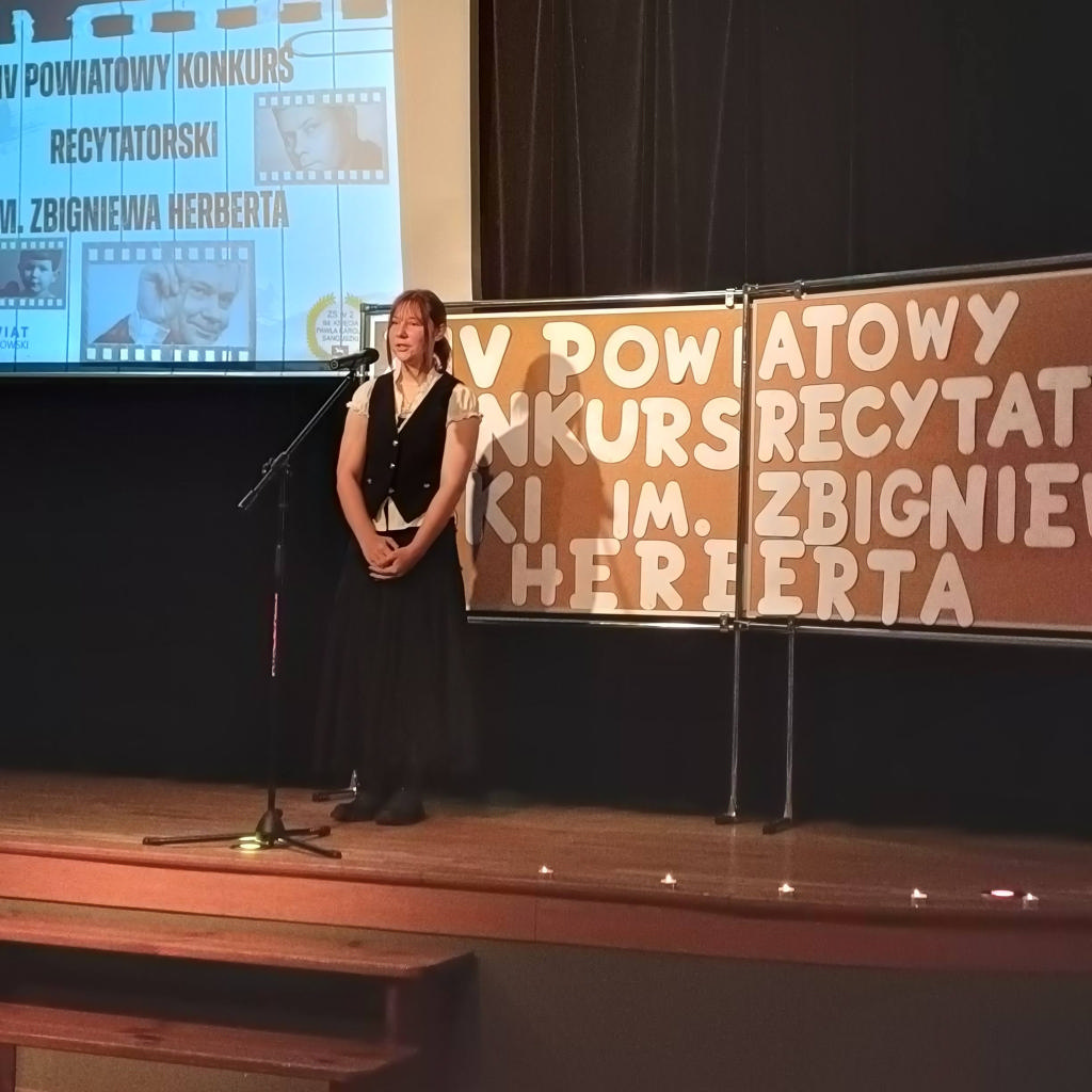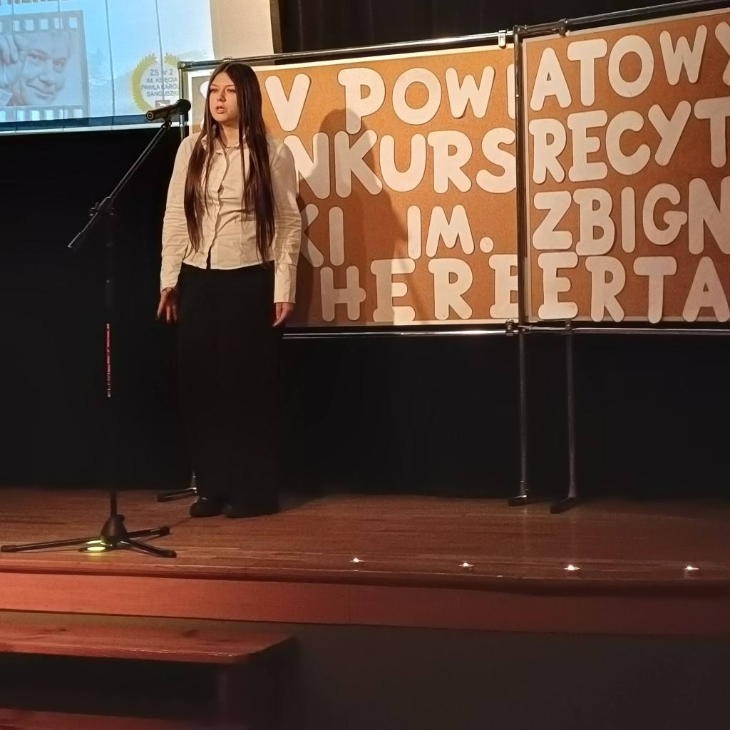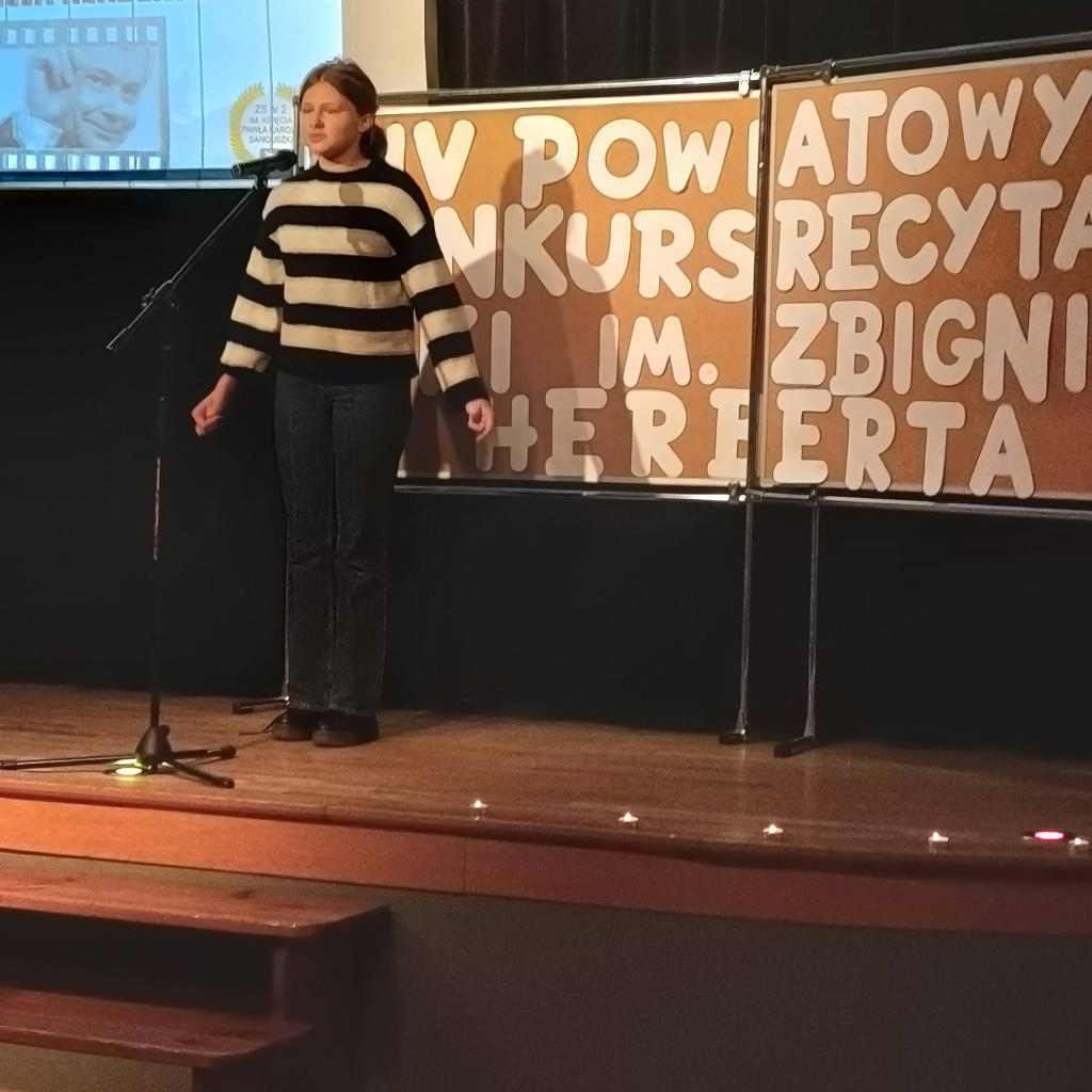 Udział w konkursie stanowił okazję do rozwijania zdolności scenicznych oraz budowania wrażliwości literackiej. Spotkanie odbyło się w kameralnej atmosferze, w sali rozświetlonej blaskiem świec. Nastrojowa oprawa wydarzenia podkreśliła piękno recytowanych utworów. Miło nam poinformować, że interpretacja poezji Z. Herberta, zaprezentowana przez uczennice naszej szkoły, została doceniona przez jury.